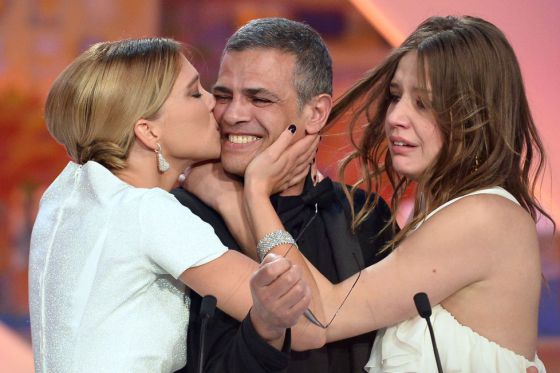 Abdellatif Kechiche, junto a las actrices Adèle Exarchopoulos y Léa Seydoux, que lo besa al recibir la Palma de Oro. / ALBERTO PIZZOLI (AFP)