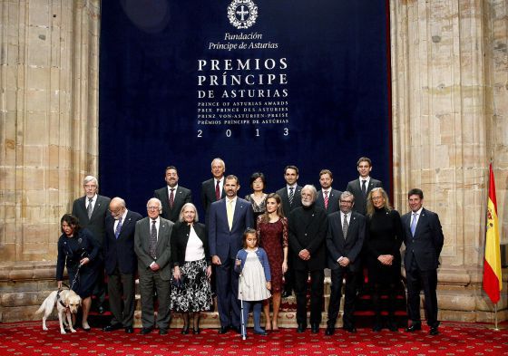 Don Felipe y doña Letizia posan con los galardonados con los Premios Príncipe de Asturias 2013, durante la audiencia que tuvo lugar en el Hotel de la Reconquista de Oviedo. /BALLESTEROS (EFE