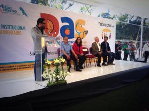 Víctor Hugo Romo (al micrófono) y Claudia Cervantes (de rojo) en un acto oficial en la capital de México.