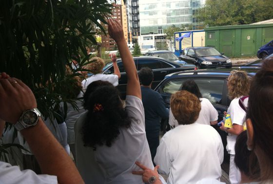 Enfermeras reciben el coche de Rajoy lanzándole guantes y protestando. / M.A.T.