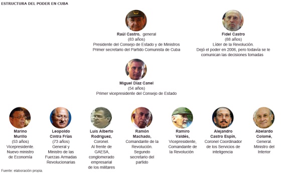 Tras 56 años en pie de guerra, la onda expansiva de la normalización entre Cuba y Estados Unidos puede modificar el organigrama y perfil del poder revolucionario, cuya cúspide ocupan Raúl Castro, los comandantes de Sierra Maestra y un grupo de generales, todos miembros del buró político y del comité central del Partido Comunista de Cuba (PCC). Fidel Castro sigue ahí, icónico, pero en chándal. Si el acercamiento binacional progresa, la profundización de los intercambios, los viajes, los turistas, y el estrechamiento de las relaciones políticas y económicas pueden conducir a un cambio en la correlación de fuerzas en el equipo al mando, esto es a la progresiva entrada de civiles en importantes despachos. Hasta ahora los militares desempeñan las funciones ejecutivas estratégicas. La influencia de tecnócratas y paisanos es limitada.